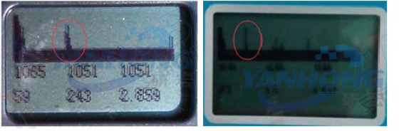 研宏YCS系列超声波液位计有个功能是能够看到现场反射回来的超声波的波形,通过回波的形状可以大致判断现场的故障原因。下面我给大家讲解一下。一、电磁干扰 现场的电磁干扰最主要来自于变频器、电动机、离心机等的干扰,这些干扰很大一部分通过电网传播,一个工厂的供电系统有一台变频器就会污染整个电网。我们先看看正常的回波图: 图3 正常的反射波信号 上面两张图是正常的回波图,最下面的基线,也就是从左到右这么一长条的横条,有大约4mm高度的,都比较清晰,没有毛刺,从左到右都是一样高度。图中打圈的就是反射的超声波信
